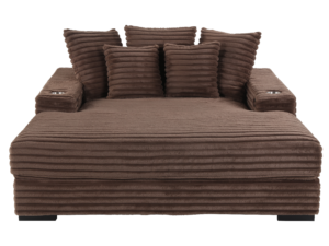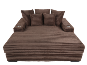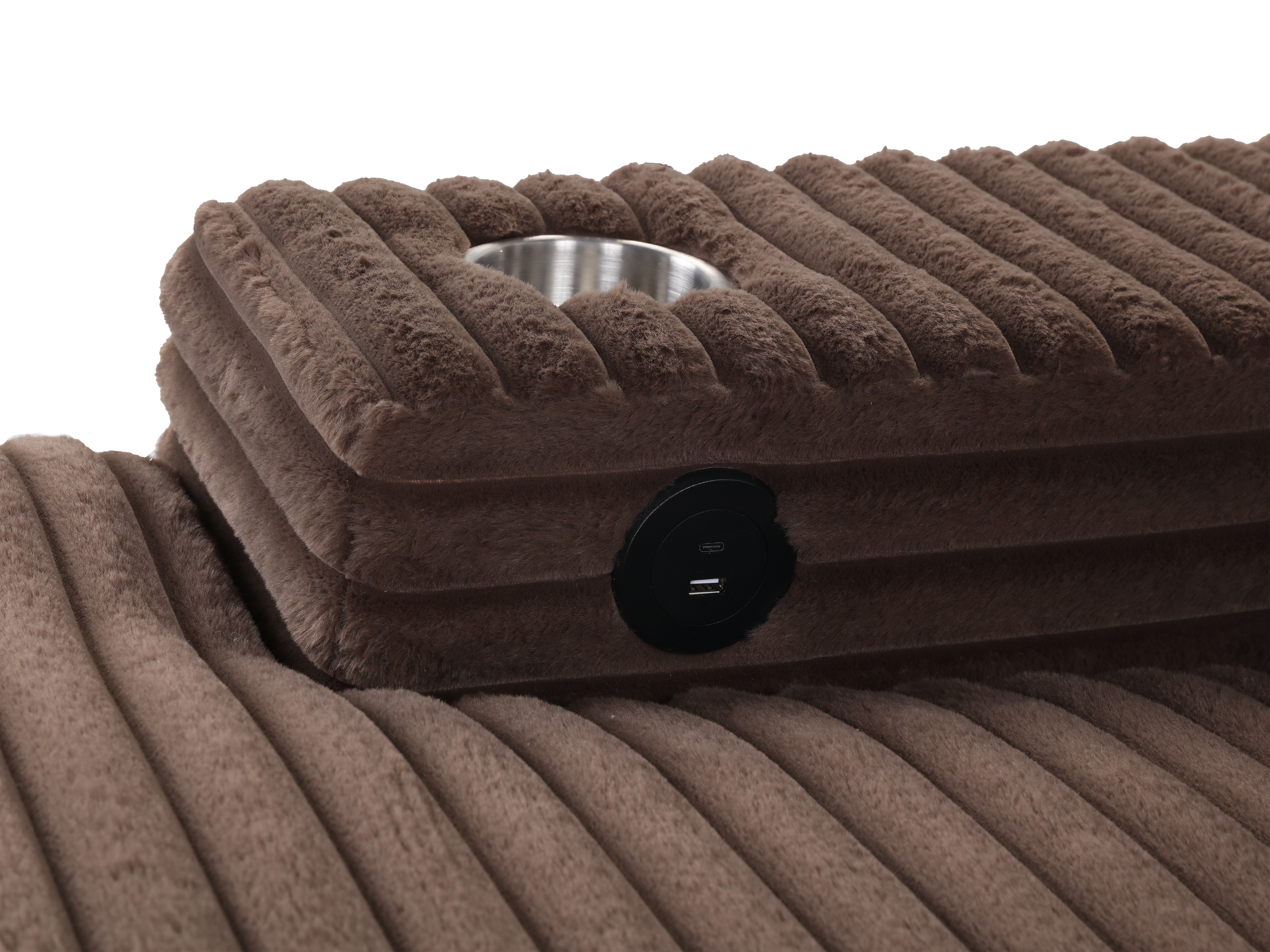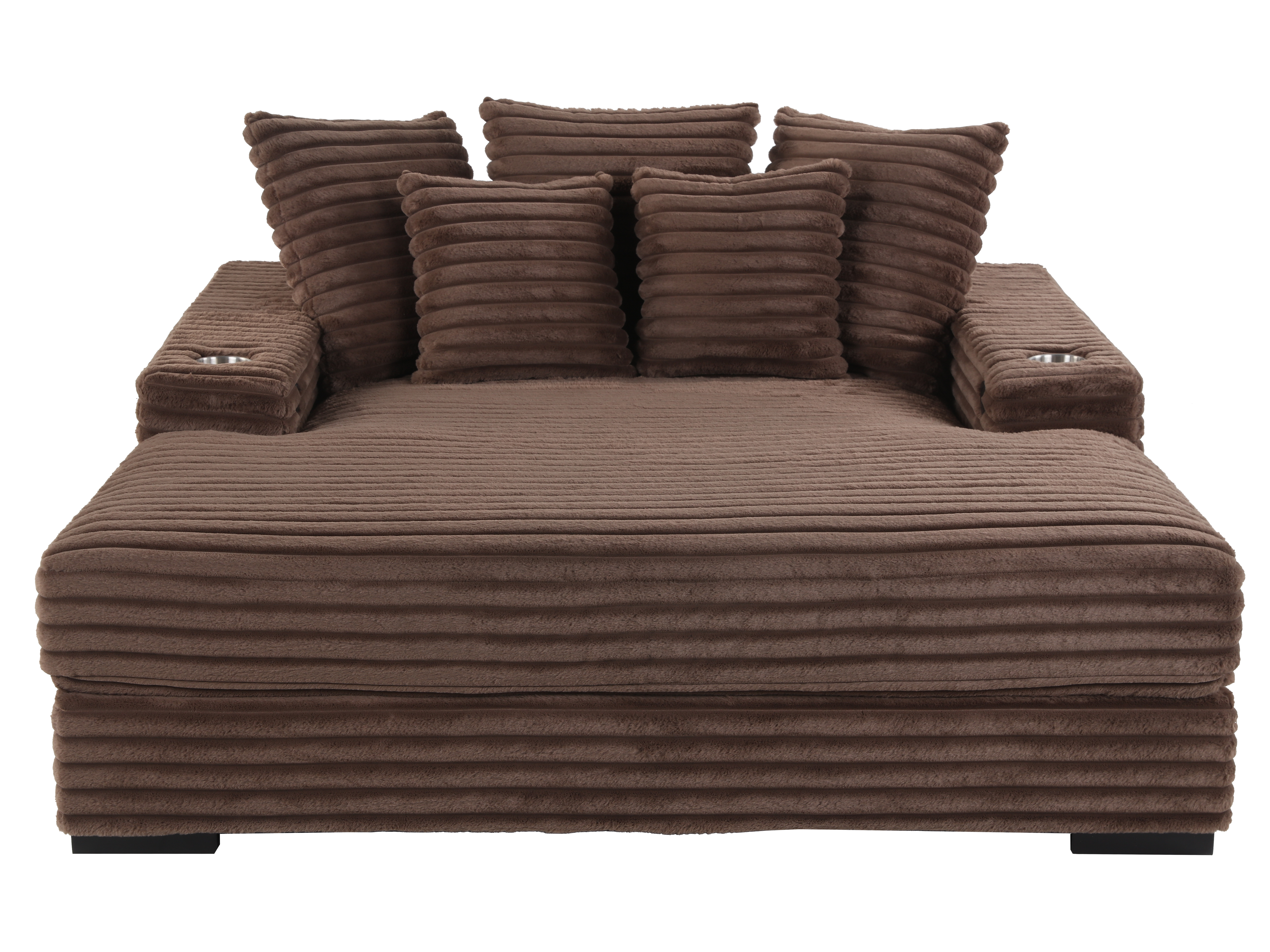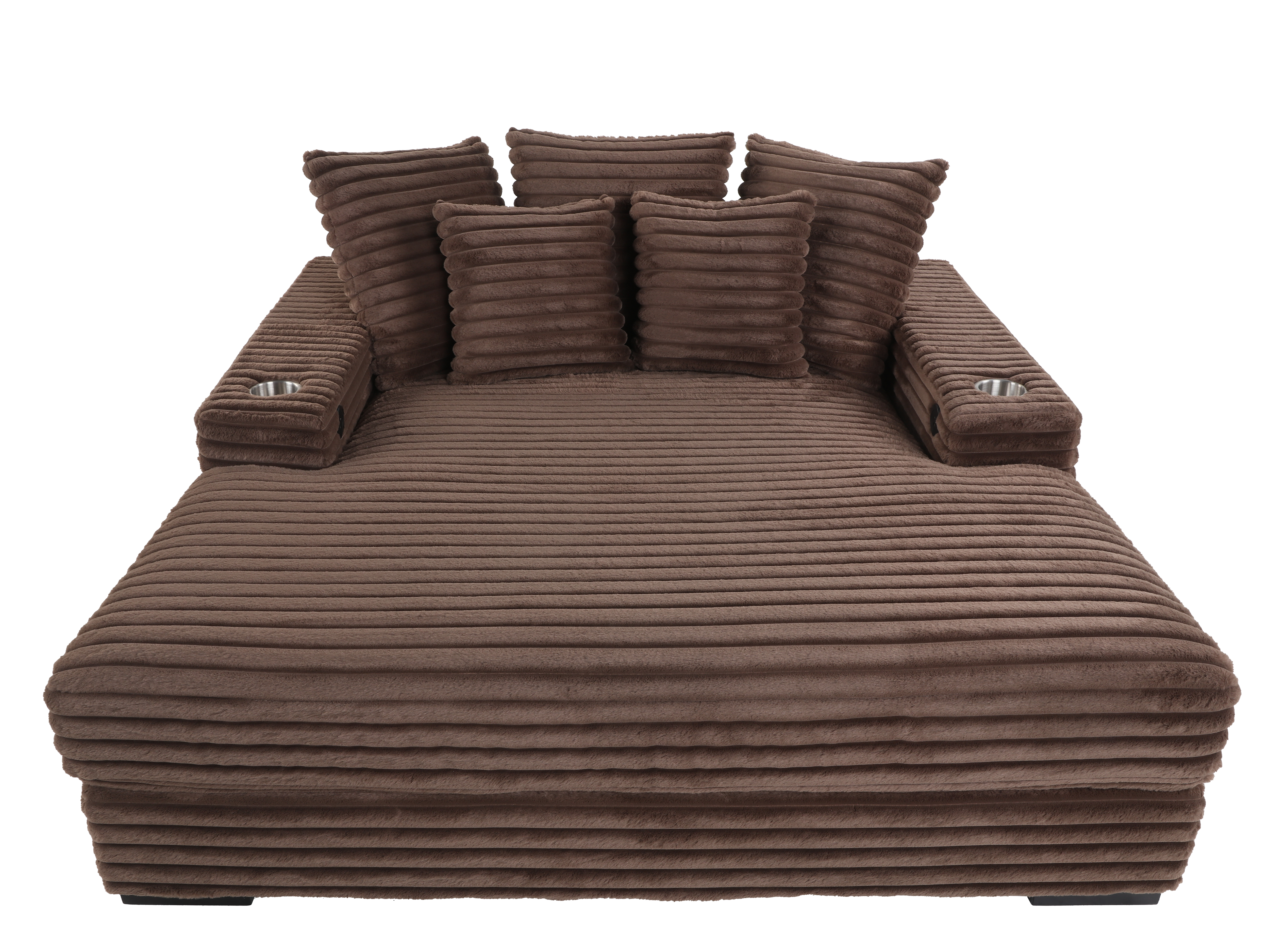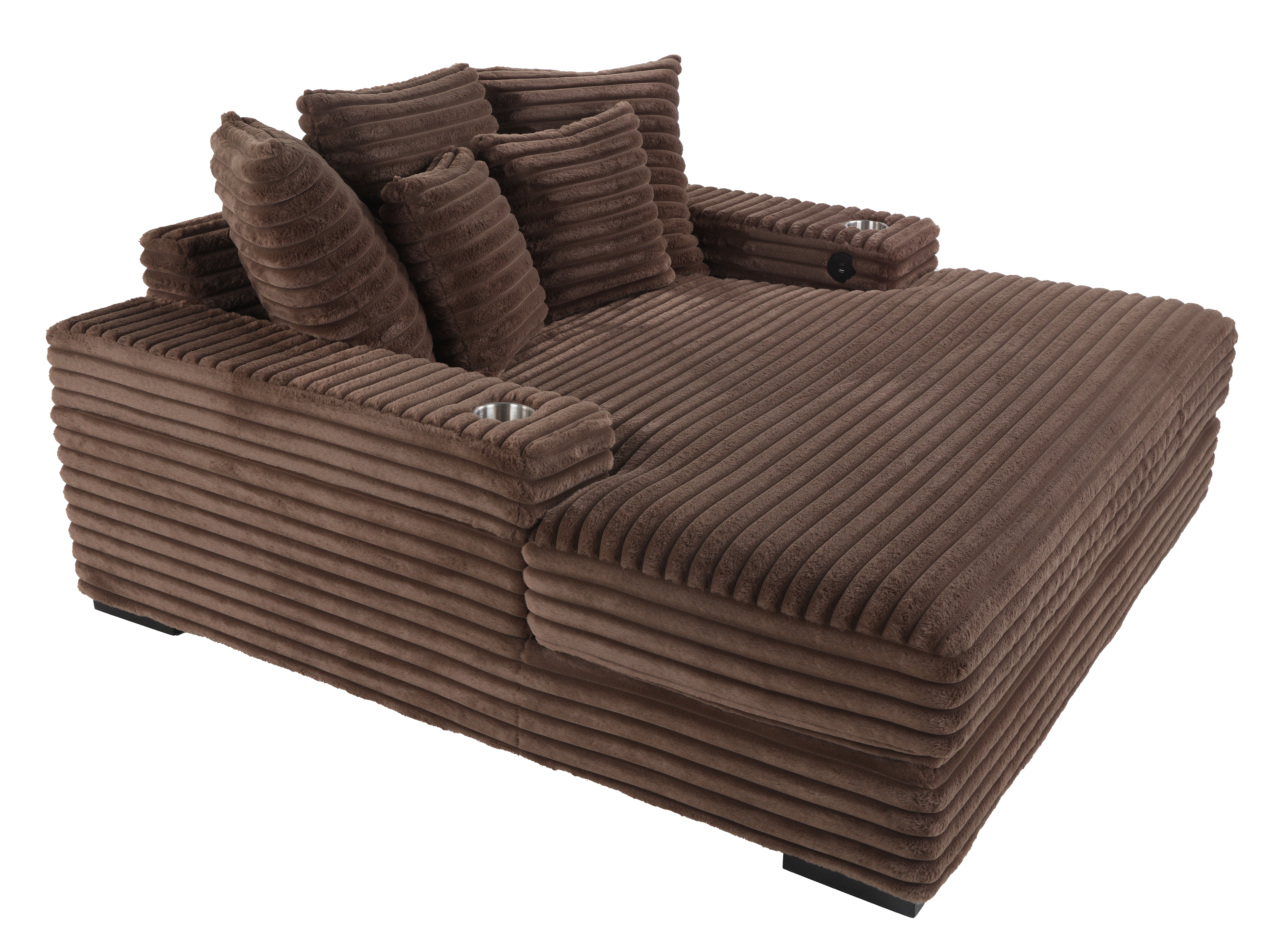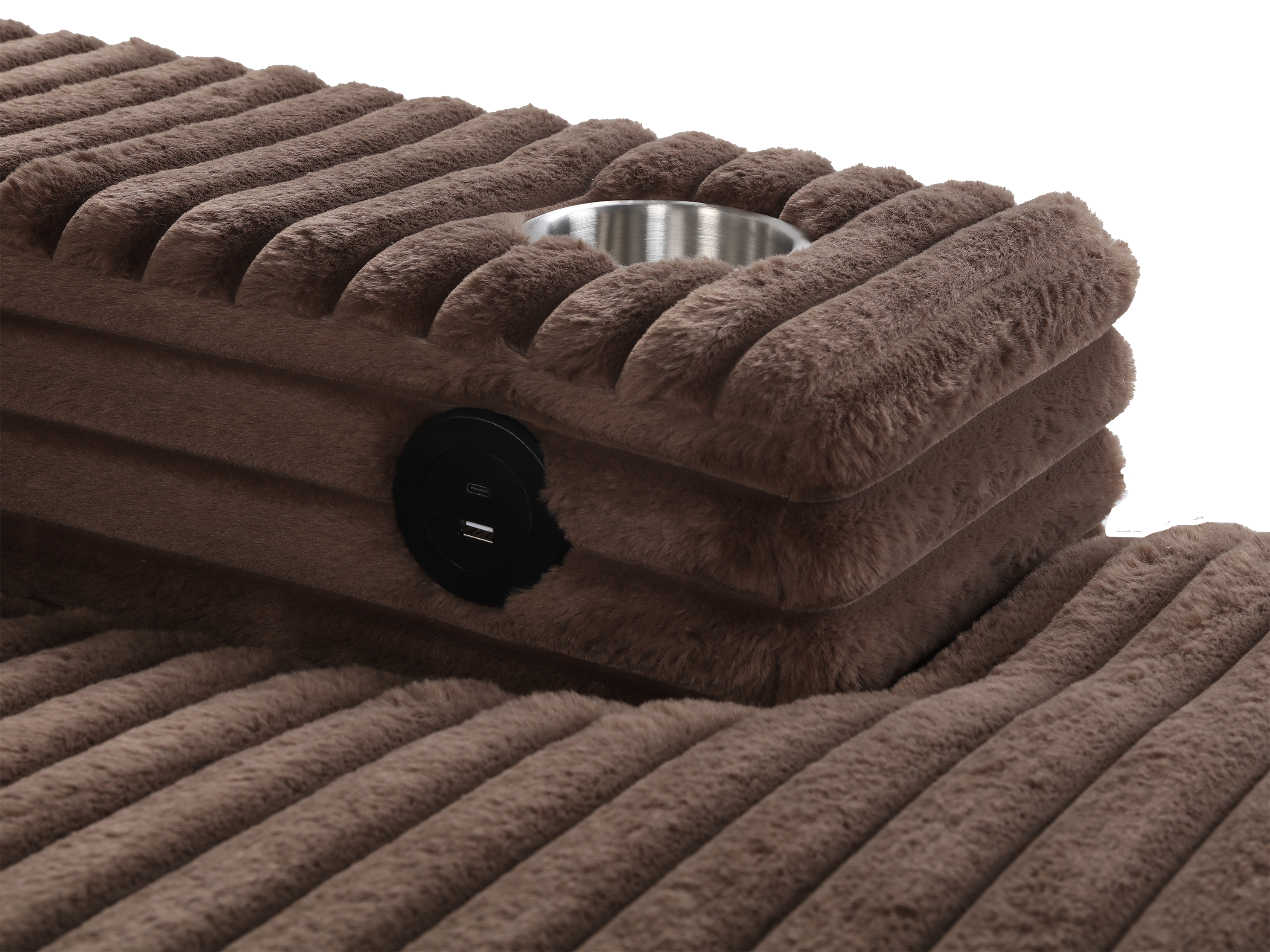 This luxurious chaise lounge blends modern functionality with timeless comfort. Upholstered in a brown velvet fabric, it exudes elegance while providing the ultimate relaxation experience. The chaise features three large backrest pillows and two throw pillows, all designed with a plush ribbed texture for added coziness and support. Both armrests are thoughtfully equipped with built-in cup holders and USB charging ports, ensuring that your beverages and devices are always within easy reach. Perfect for lounging, reading, or watching TV, this chaise lounge is a stylish and practical addition to any living space. Its sleek design complements contemporary interiors, making it an ideal choice for those who value both comfort and convenience.