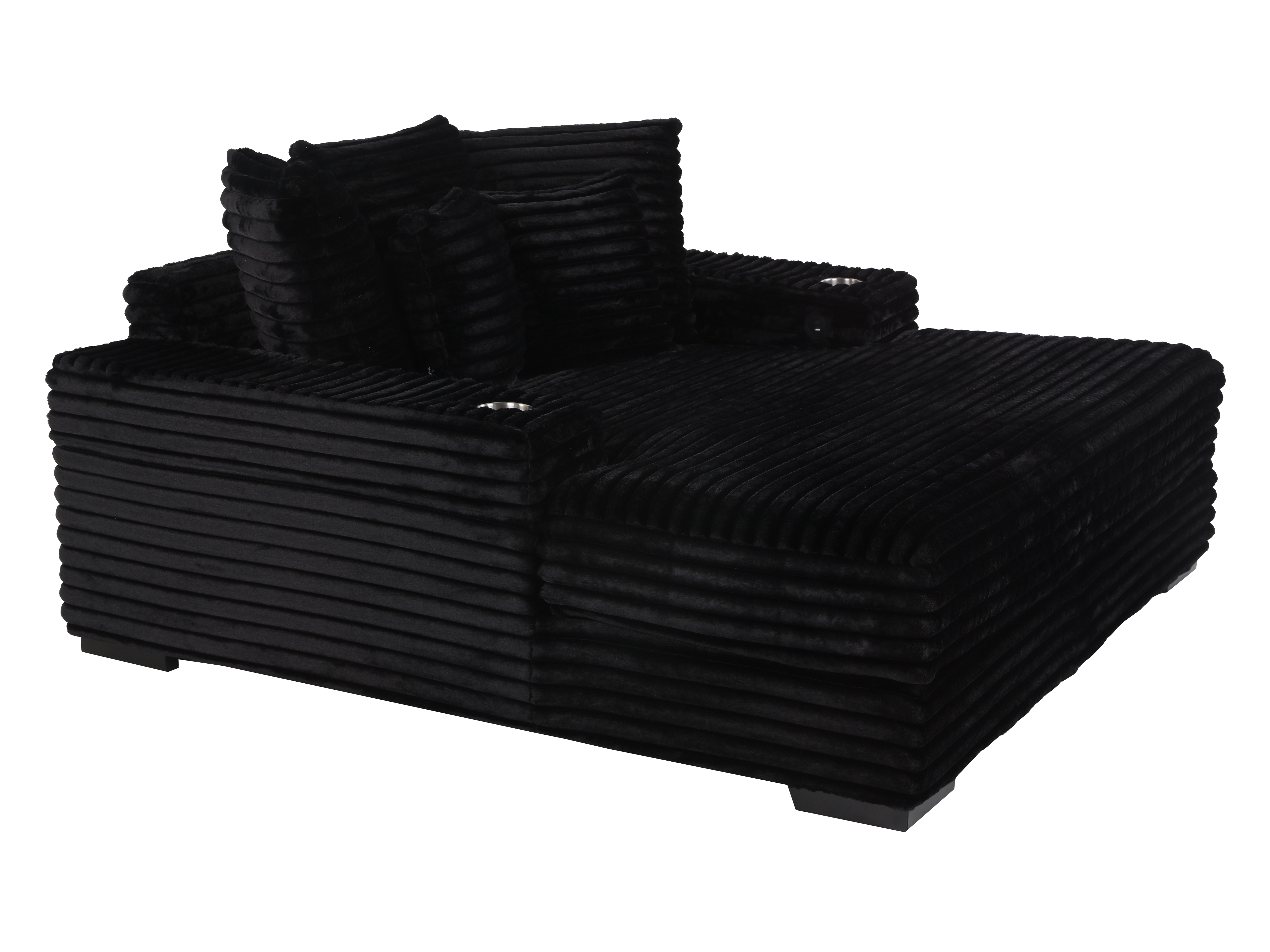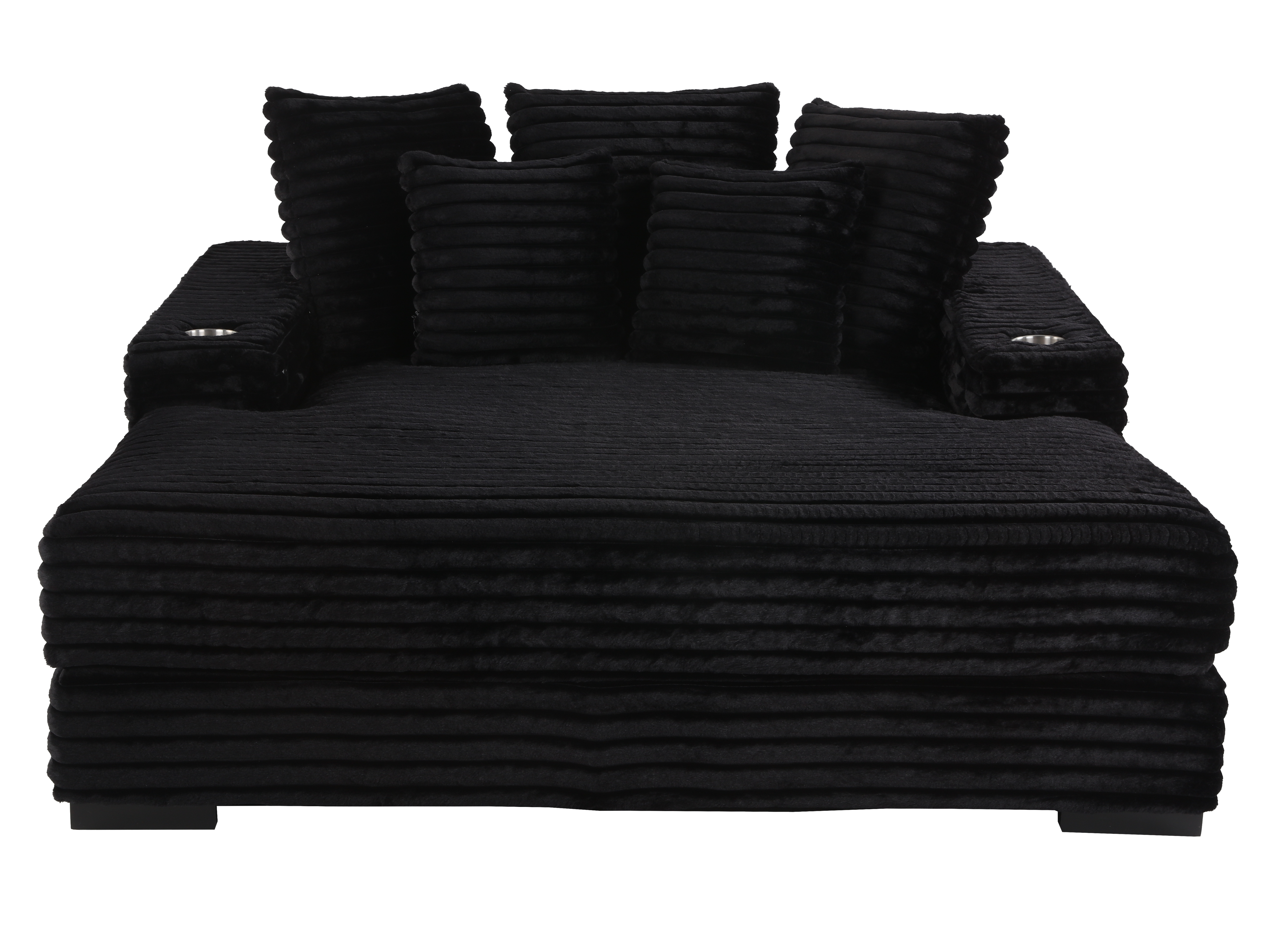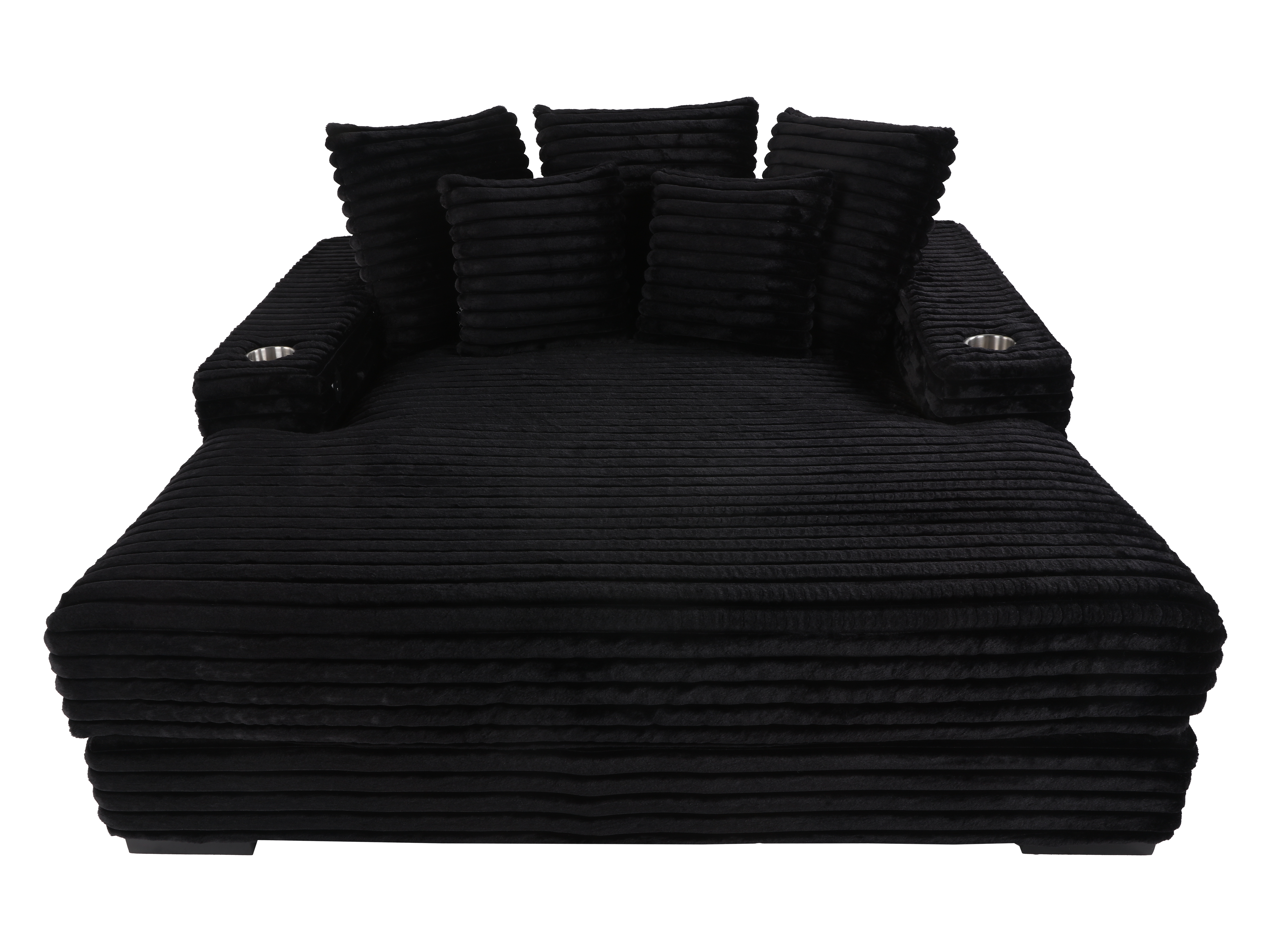 This luxurious chaise lounge blends modern functionality with timeless comfort. Upholstered in a black velvet fabric, it exudes elegance while providing the ultimate relaxation experience. The chaise features three large backrest pillows and two throw pillows, all designed with a plush ribbed texture for added coziness and support. Both armrests are thoughtfully equipped with built-in cup holders and USB charging ports, ensuring that your beverages and devices are always within easy reach. Perfect for lounging, reading, or watching TV, this chaise lounge is a stylish and practical addition to any living space. Its sleek design complements contemporary interiors, making it an ideal choice for those who value both comfort and convenience.