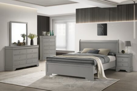 AVAILABLE ON 9/14/2025 Elevate your bedroom with the contemporary style bedroom set, designed to blend functionality with modern elegance. This complete set includes a spacious bed frame with a sleek headboard, a large dresser with an attached mirror, and a nightstand. Each piece is finished in a sophisticated gray, providing a calm and neutral palette […]